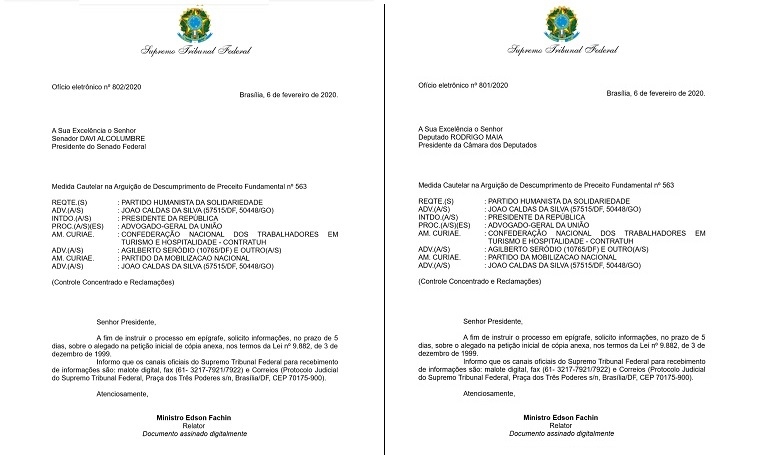 “A fim de instruir o processo, solicito informações, no prazo de 5 dias, sobre o alegado na petição inicial de cópia anexa, nos termos da Lei nº 9.882, de 3 de dezembro de 1999”, disse la carta assinada digitalmente que o Ministro e relator da ADPF 563, Edson Fachin, enviou, hoje, ao Presidente da Câmara dos Deputados, Rodrigo Maia (Ofício eletrônico nº 801/2020) e ao Davi Alcolumbre, Presidente do Senado Federal (Ofício eletrônico nº 802/2020).