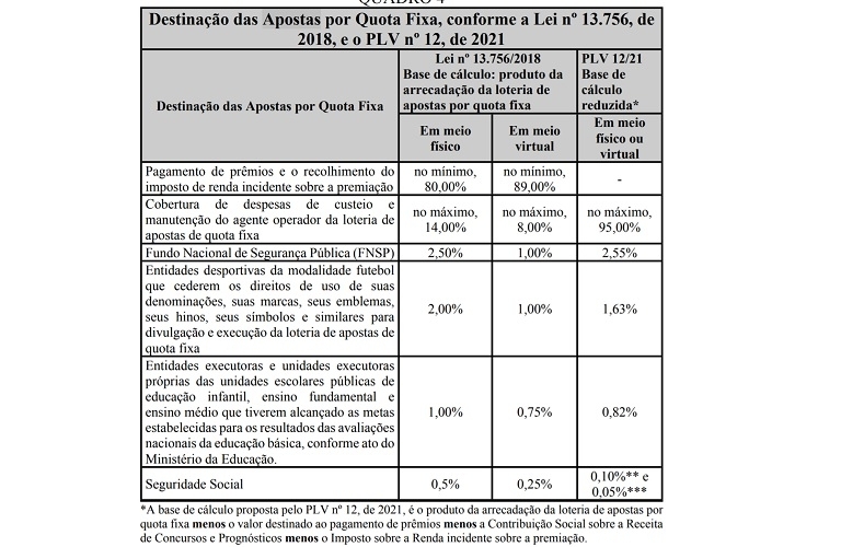 O projeto revoga a destinação do produto da arrecadação da loteria de apostas de quota fixa prevista na lei e estabelece que, do total arrecadado, sairão primeiramente os prêmios, sem fixar montante. Do que sobrar, 0,05% e 0,10% ficarão com a seguridade social; 0,82% com as escolas que alcançaram metas de desempenho em exames nacionais; 2,55% com o Fundo Nacional de Segurança Pública (FNSP); 1,63% com os clubes que tiverem cedido seus símbolos para uso da loteria e 95% com os operadores da loteria, que deve ser licitada para exploração pelo setor privado.