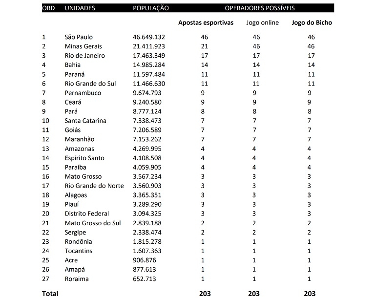 Com esta nova limitação, se depreende que no total poderão ser outorgadas um máximo de 203 licenças para operar apostas esportivas no Brasil, sempre recordando que o credenciamento para sua exploração deverá ser circunscrito ao limite territorial de cada Estado.