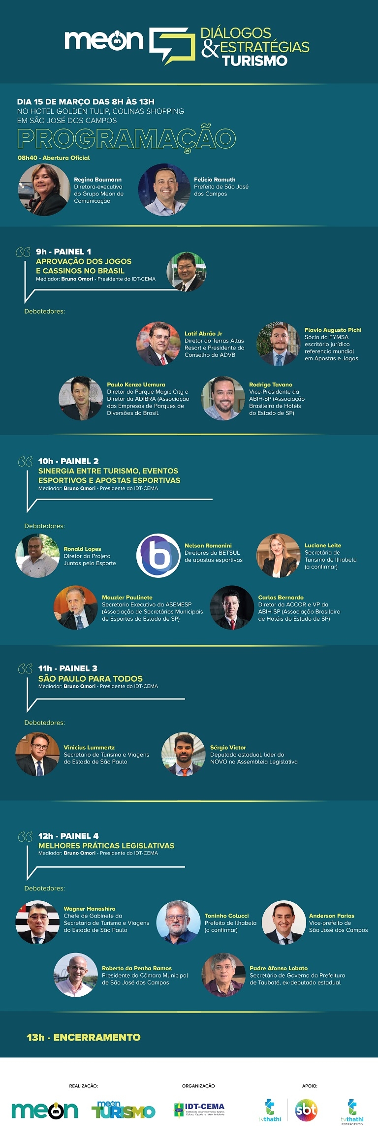 Serão quatro mesas de diálogos e estratégias: Aprovação dos Jogos e Cassinos no Brasil, Sinergia entre Eventos Esportivos e Apostas Esportivas, São Paulo para Todos e Melhores Práticas Legislativas. O evento trará os grandes nomes do setor para dialogarem com prefeitos, assessores de turismo e vereadores no intuito de preparar os municípios para políticas públicas de estímulo ao setor e captação de novos investimentos. Vinicius Lummertz, secretário de Turismo e Viagens do Estado de São Paulo, está entre os integrantes do painel.