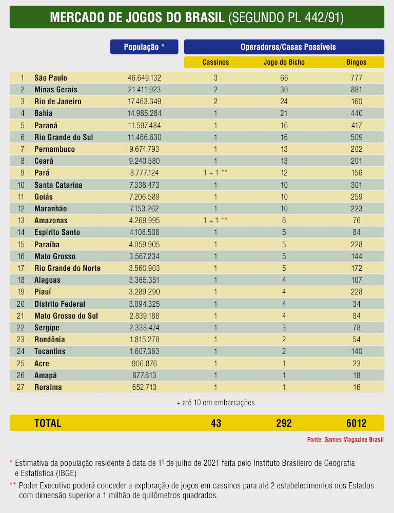 Das 27 unidades da federação, apenas Acre, Amapá e Roraima poderiam explorar um único estabelecimento. O cálculo total aponta que o Brasil poderá ter 292 pontos de jogo do bicho legalizados.