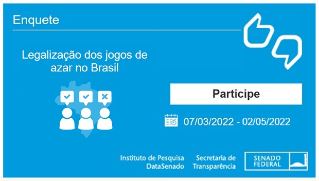 O DataSenado, instituto de pesquisa do Senado Federal, prorrogou o prazo final para respostas da pesquisa para conhecer o que pensam os brasileiros sobre a legalização dos jogos de azar no Brasil. O prazo final estipulado pelo DataSenado quando lançou a pesquisa na primeira semana de março era 1º de abril, mas foi postergado até o dia 2 de maio.
