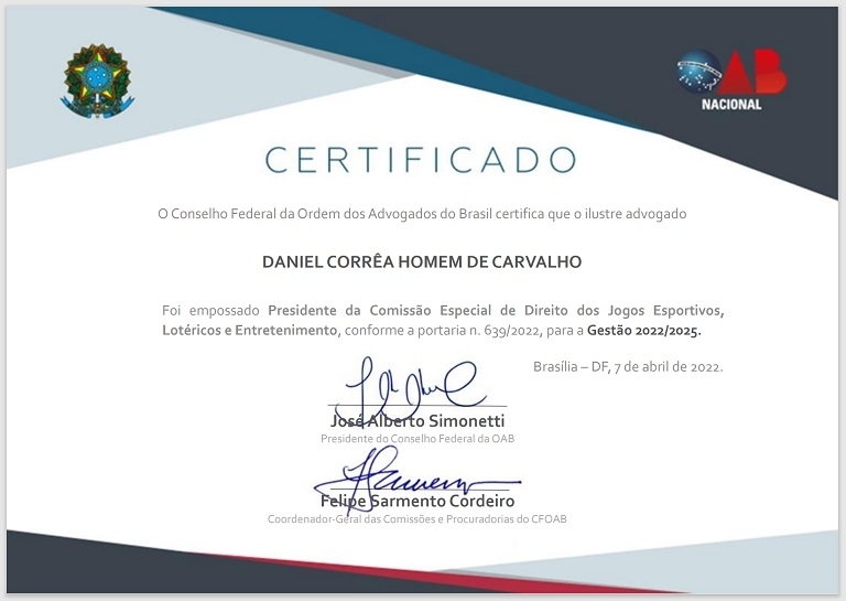 Por meio da portaria 639/22, o presidente do Conselho Federal da Ordem dos Advogados no Brasil, João Alberto Simonetti, nomeou o advogado e ex-presidente da Loterj Daniel Homem de Carvalho como presidente da Comissão Especial de Direito dos Jogos Esportivos, Lotéricos e Entretenimento do órgão.