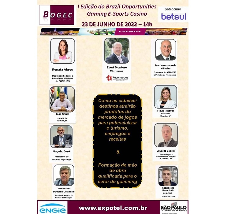 A abertura do BOGEC, que tem patrocínio da casa de apostas Betsul, acontece às 14 horas com o tema “Oportunidades para os meios de hospedagem e produtos turísticos para fechamento de parcerias com operadores e investidores”, que contará com a participação de Luiz Felipe Maia (Maia & Yoshiyasu Advogados), Nelson Romanin Neto (Betsul), Carlos Cardama (Games Magazine Brasil), Bruno Omori (IDT-CEMA), Renata Abreu (deputada federal), e Evert Montero Cárdenas (Fecoljuegos/Colômbia), além de nomes do trade turístico e da política.
