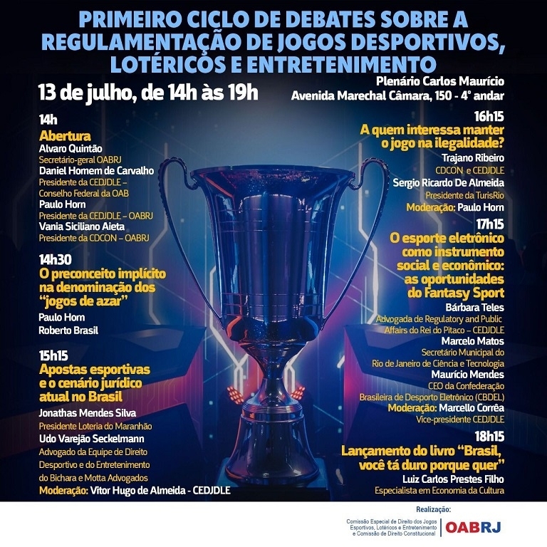 Trajano Ribeiro, da Comissão de Direito Constitucional e da CEDJDLE, discutirá com Sérgio Ricardo de Almeida, ex-presidente da Loterj e atualmente à frente da TurisRio, a quem interessa manter o jogo na ilegalidade, com moderação de Paulo Horn.