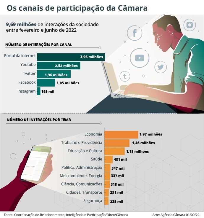 Os canais de participação da sociedade com a Câmara dos Deputados tiveram quase 9,7 milhões de interações entre fevereiro e junho deste ano. O principal meio de participação da sociedade com as propostas em discussão pelos deputados permanece sendo o portal da Câmara, que teve quase 4 milhões de interações, incluindo comentários de notícias, enquetes e outros recursos.