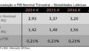 Ao observar a arrecadação real trimestral (deflacionada pelo IPCA) das loterias federais no período 2014 a 2017, há um declínio de R$ 3,5 bilhões, no segundo trimestre de 2014, para R$ 3,4 bilhões (queda de 3,7%), no segundo trimestre de 2017, consoante gráfico abaixo.