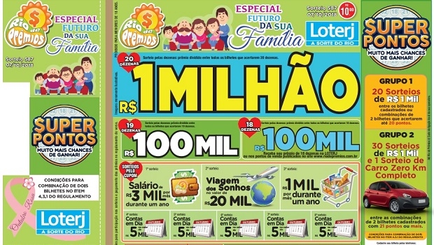 Para realizar sonhos e oferecer a oportunidade de um futuro melhor, no mês de outubro o Rio de Prêmios lança o bilhete Especial Futuroda Sua Família. O principal sorteio acontece no dia 7 e quem acertar 20 dezenas será contemplado com R$ 1 milhão.