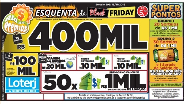 No último domingo de novembro, 25, a Black Friday do Rio de Prêmios proporciona a chance de ganhar R$ 500 mil para quem fizer 20 pontos, e será a última chance de concorrer aos 50 sorteios de R$ 1.000,00 pelo cupom, que proporcionam maiores chances de ganhar.