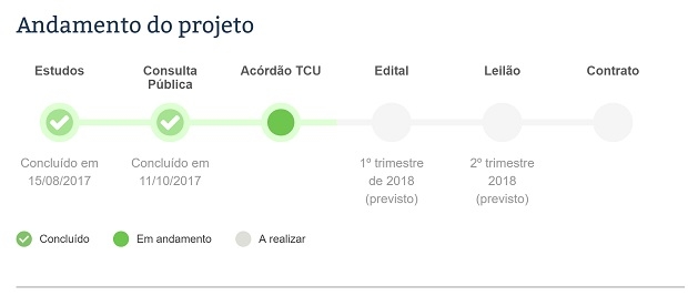 Atualmente, o projeto encontra-se sob análise do Tribunal de Contas da União – TCU. O BNDES concluiu os estudos em agosto/2017. Em 12 de setembro de 2017 foi publicado o Decreto que outorga poderes de execução do processo de contratação ao BNDES.