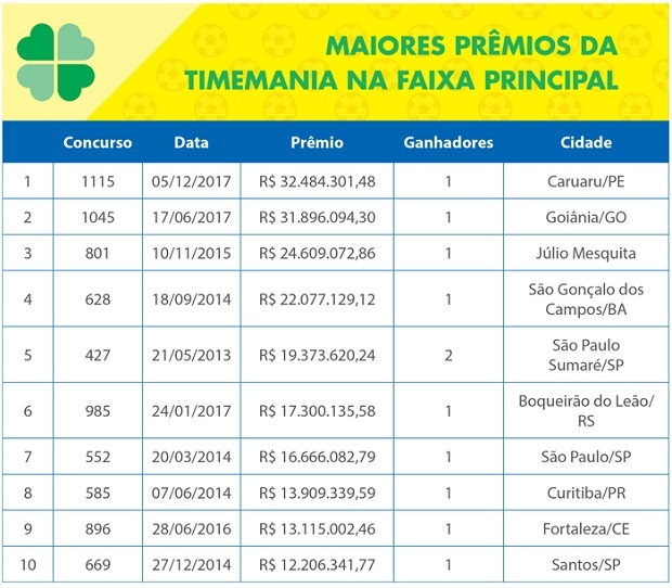 Confira os 10 maiores prêmios nos 10 anos da Timemania: