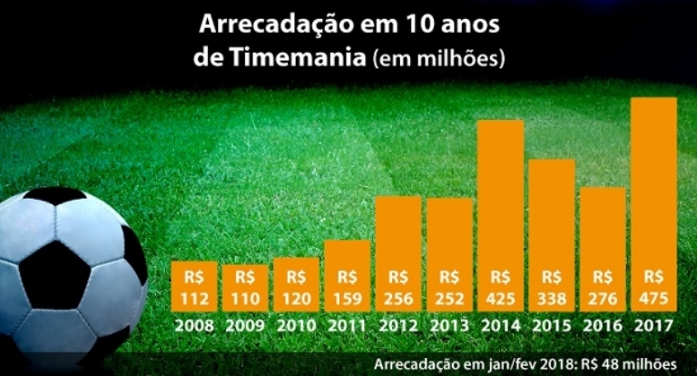 A Timemania foi se consolidando ao longo dos anos e percebe-se o aumento no volume de apostas. Em 2008, a arrecadação foi de R$ 112 milhões, que dobrou para R$ 256 milhões em 2012, e quadruplicou em 2017, com R$ 475 milhões. A arrecadação recorde de R$ 475,91 milhões em 2017 representou 3,43% de participação nas vendas totais das Loterias CAIXA.