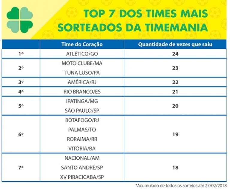 Dos clubes de futebol no volante de apostas, o Atlético Goianiense despontou como o Time do Coração mais sorteado na história da Timemania. Foram 24 vezes em 10 anos. Em seguida, com 23 vezes, o Moto Clube, do Maranhão, e o Tuna Luso, do Pará.