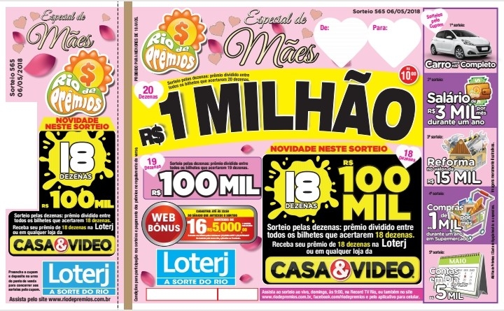 O Dia das Mães está chegando. A data que é sinônimo de almoço em família, afeto e carinho também poderá ser o dia de sorte de um morador do estado do Rio de Janeiro. Isso porque o Rio de Prêmios, produto da Loteria do Estado do Rio de Janeiro (Loterj), sorteará no próximo domingo (6/05) R$ 1 milhão para quem acertar as 20 dezenas do bilhete. No sorteio pelas dezenas, o prêmio de R$ 100 mil será dividido entre todos os bilhetes que acertarem 19 dezenas. Pela primeira vez, também serão contemplados os de 18 acertos, que repartirão outros R$ 100 mil. Esse último prêmio poderá ser recebido na sede da Loterj, no Centro do Rio, ou em uma das lojas da Casa & Vídeo.