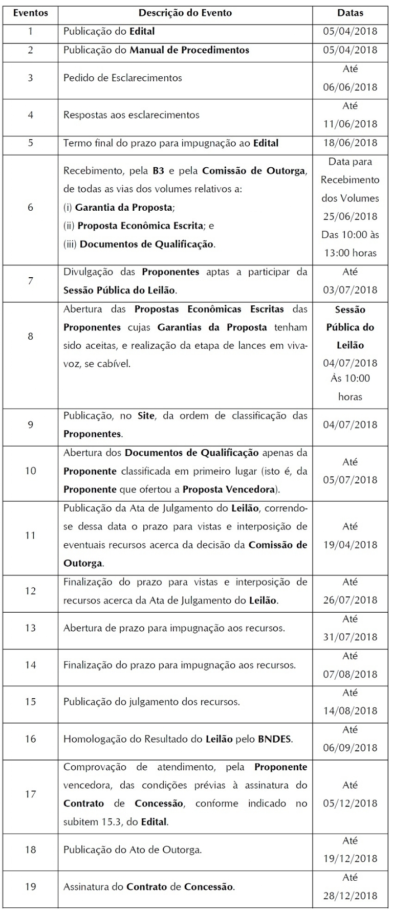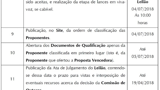 A divulgação das proponentes aptas a participar da Sessão Pública do Leilão será realizada no dia 3 de julho. O Leilão, com a participação das Proponentes que tiverem suas Garantias de Proposta aceitas, representadas por Corretoras Credenciadas, será realizado no dia 4 de julho de 2018, às 10 horas, na B3. Ali será a abertura das propostas econômicas escritas das proponentes cujas garantias da proposta tenham sido aceitas, e realização da etapa de lances em vivavoz, se cabível.