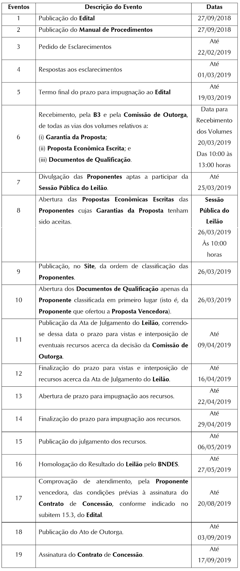 A definição de novos dias para esses eventos importa, por consequência, na necessidade de alterar as demais datas estipuladas no item 12.1 do Edital do Leilão n.º 3/2018-PPI/PND, o qual passa a vigorar nos seguintes termos: