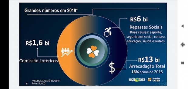 O vice-presidente Paulo Henrique Angelo e sua equipe destacaram para o público 50 entregas que representam importantes inovações para as Loterias CAIXA. “Nós somos a sexta maior loteria do mundo. Olha o tamanho do nosso negócio. E nós queremos a cada dia mais valorizar e reconhecer o trabalho de vocês lotéricos, mas não só com palavras, e sim valorizar com ações, com reconhecimento e com entregas efetivas”, ressaltou o VP Agente Operador, que adiantou o resultado do acumulado das Loterias até outubro de 2019, que já supera em 16% o resultado do mesmo período do ano passado.