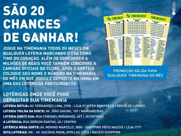 O intuito do clube marujo é ficar entre os 20 melhores do ranking na TimeMania, já que através dele poderá obter investimentos para quitar dívidas. Sem limite de apostas, os torcedores poderão realizar jogos a partir de R$2,00 e após o sorteio dos bilhetes que acontecem nas terças, quintas e sábados, poderá inseri-los em urnas espalhadas por loterias de Maceió para concorrer ao manto azulino.