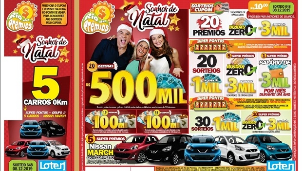 O Rio de Prêmios inicia o mês de dezembro com um sorteio de esquenta para o Natal que vai fazer muito apostador achar que leram a carta que enviou para o Papai Noel. Quem comprar o bilhete dessa semana vai concorrer no próximo domingo (8) a uma superpremiação de cinco Nissan March 0km no Super Pontos para já chegar nas Festas de Fim de Ano em grande estilo.