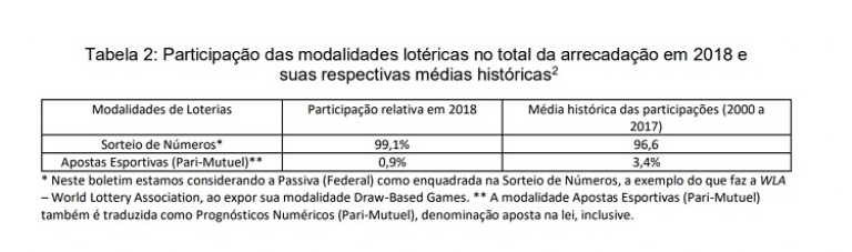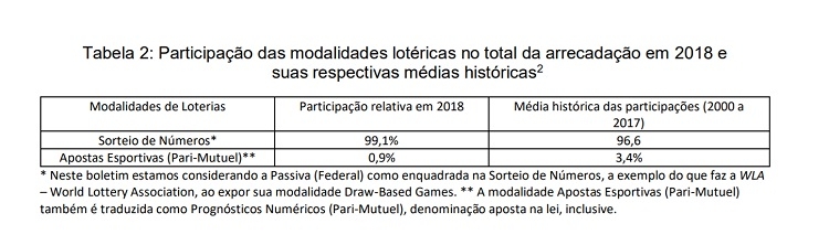 A análise do mercado nacional de loterias por meio das duas modalidades lotéricas atualmente existentes (Sorteio de Números e Prognósticos Esportivos Pari-Mutuel) mostra que as vendas dos produtos lotéricos se concentram na modalidade de Sorteio de Números, cujo percentual médio de participação no total da arrecadação lotérica ficou em 96,6%, entre os anos de 2000 a 2017, e, em 99,1%, em 2018, como observado na tabela 2.