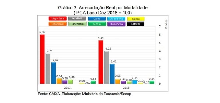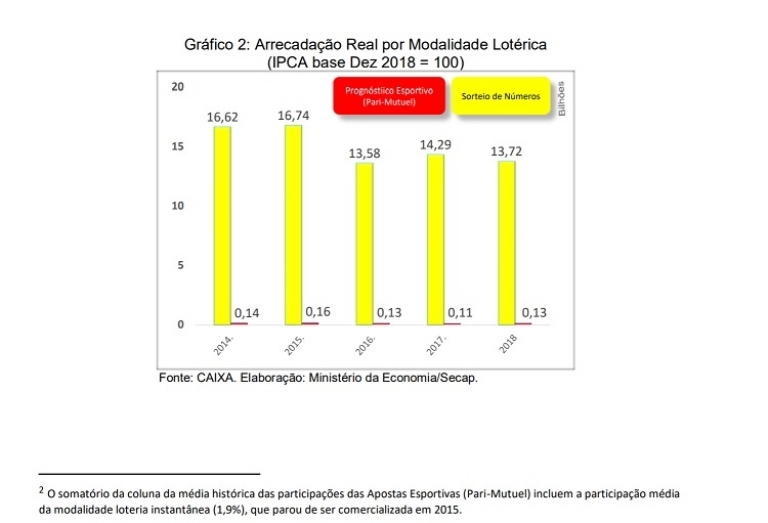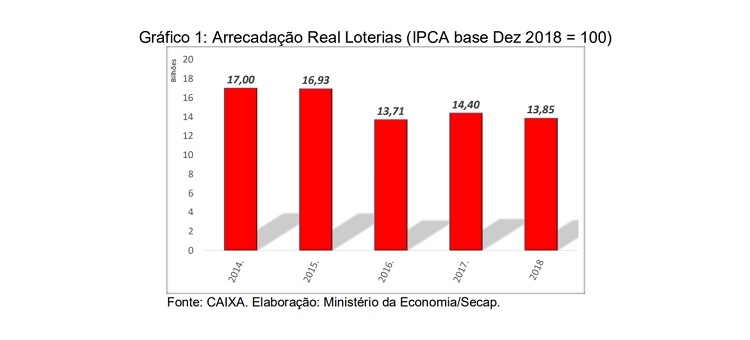 Essas duas modalidades apresentaram simultaneamente expressiva queda real entre os anos de 2014 a 2018. As vendas das loterias da modalidade Sorteio de Números caíram em torno de 8%, de R$ 16,62 bilhões para R$ 13,72 bilhões, enquanto a modalidade Apostas Esportivas Pari-Mutuel apresentou queda na magnitude de 7%, caindo de R$ 140 milhões para R$ 130 milhões.