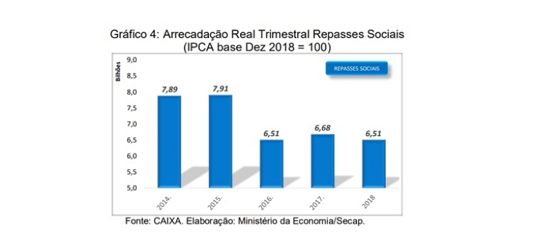 Com a diminuição da arrecadação nominal no ano 2018 em relação a 2017, ocorreu também retrocesso real dos recursos destinados aos programas sociais, na ordem de 2,6%, entre o ano de 2017 (R$ 6,68 bilhões) e o ano de 2018 (R$ 6,51 bilhões). Já em relação ano de 2014, a queda real acumulada foi bem mais relevante, da ordem de 17,4%, consoante se atesta no gráfico 4.