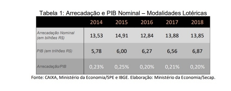Na tabela 1, em uma comparação do ano de 2018 com o ano anterior, observa-se que, em termos nominais, a arrecadação das loterias federais diminuiu 0,2% no período, passando de R$ 13,88 bilhões para R$ 13,85 bilhões. Ao se comparar a arrecadação com relação ao Produto Interno Bruto1 (PIB) também houve diminuição, de 0,21% do PIB, no ano de 2017, para 0,20% do PIB, no ano de 2018.