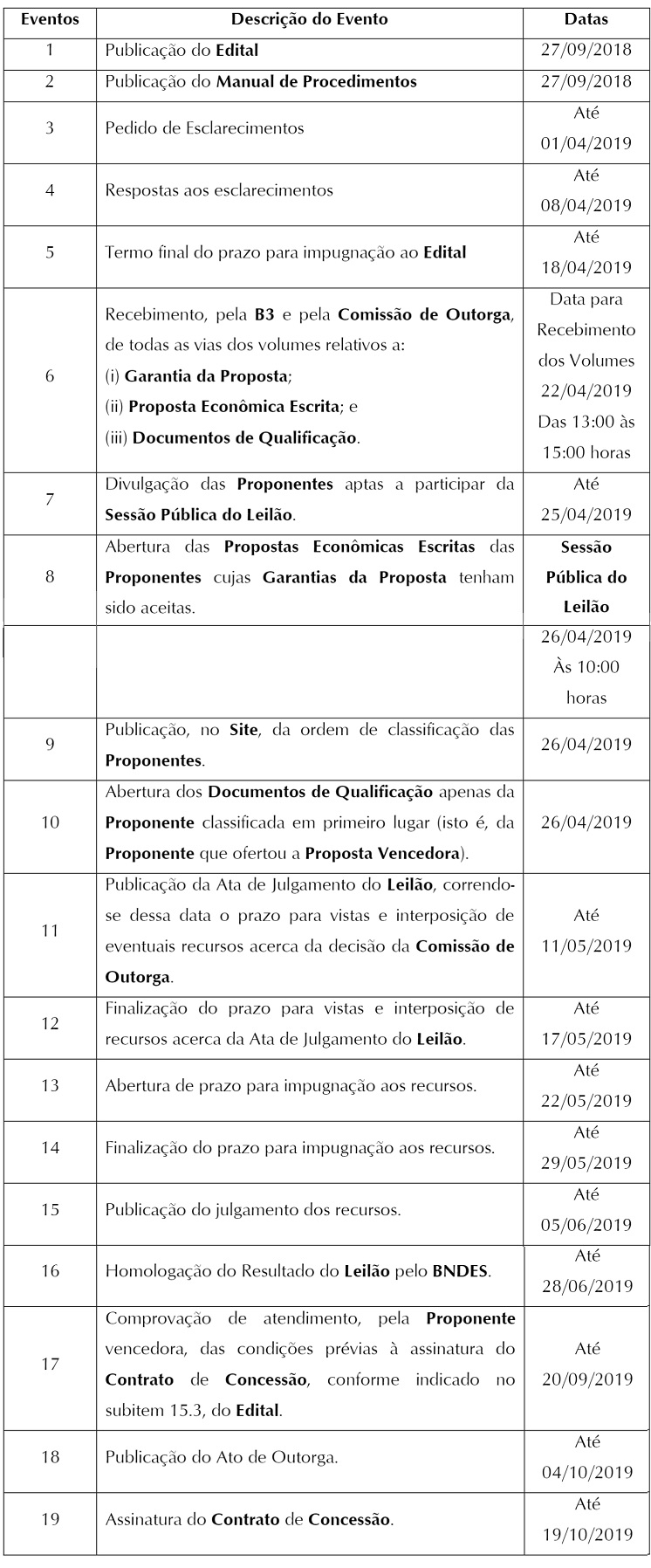 A definição de novos dias para esses eventos importa, por consequência, na necessidade de alterar as demais datas estipuladas no item 12.1 do Edital do Leilão n.º 3/2018-PPI/PND, o qual passa a vigorar nos seguintes termos: