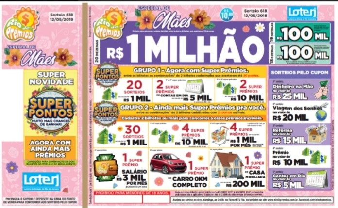 Super Pontos - Para concorrer aos sorteios Super Pontos, basta cadastrar o número de cada bilhete comprado no site do Rio de Prêmios até 23h59min de sábado. O endereço é www.riodepremios.com.br. O cadastro também pode ser feito através de aplicativo para celular ou no Alô Rio de Prêmios (98801-9977). As combinações dos bilhetes são feitas de dois em dois, até o limite de 30 bilhetes, conforme previsto no item 4.3.1 do regulamento impresso no verso dos bilhetes.