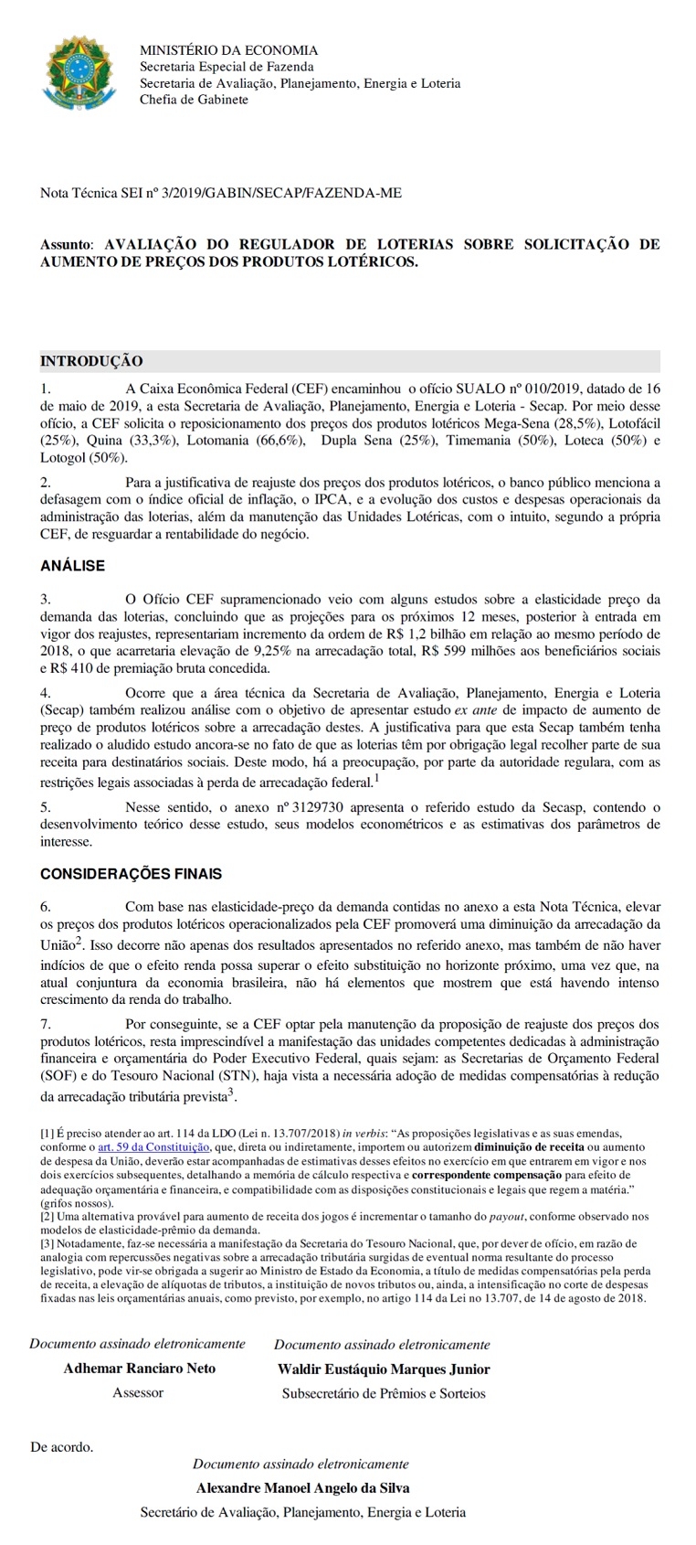 Área técnica da SECAP também realizou a análise com o objetivo de apresentar estudo ante ao impacto do aumento de preço de produtos lotéricos sobre a arrecadação. A justificativa para que a SECAP também tenha realizado o referido estudo se apoia no fato de que as loterias têm por obrigação legal recolher parte de sua receita para fins sociais. O estudo completo contém 53 páginas.