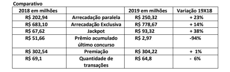 A evolução positiva em 2019 foi creditada ao aumento do valor das apostas, a estratégia de perseguir objetivos, um acompanhamento mais apurado dos concursos especiais, mesmo com uma acumulação de prêmios menor.