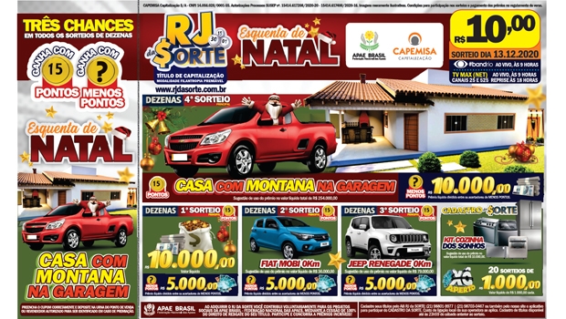 Realizar o sonho da casa própria é o 2° maior desejo de consumo do brasileiro, segundo pesquisa do Ibope Inteligência. Perde apenas para educação. E neste Esquenta de Natal do RJ DA SORTE, o morador do Rio de Janeiro vai poder concretizar a casa e ainda levar uma picape Montana 0km na garagem. E não para por aí, pois serão quatro sorteios das dezenas, com chance de ganhar com 15 ou menos pontos. Nos outros sorteios estarão em jogo um Jeep Renegade, um Fiat Mobi e prêmios em dinheiro.