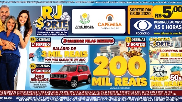 O próximo sorteio do ‘RJ da Sorte’ será no domingo, dia 3/05. O cliente concorre a três sorteios principais nas dezenas, valendo salário de R$ 3 mil por um ano, um Jeep Renegade e R$ 200 mil em dinheiro. E não é só isso. No ‘Cadastro da Sorte’, os apresentadores Vivi Romanelli, Carlos Alberto e Aline Malafaia vão sortear compras de R$ 1 MIL por mês durante um ano e 50 prêmios ‘Xô Aperto’ de R$ 1 MIL. Tudo isso pra garantir que, agora e pelo próximo ano, você e sua família estarão tranquilos. E o título custa apenas R$ 5.
