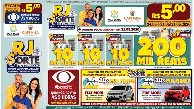 O ‘RJ da Sorte’ lançou uma novidade que agradou tanto que ganhou repeteco. Na compra do título de capitalização da CAPEMISA, o cliente vai concorrer nos sorteios de dois domingos seguidos. É isso mesmo! Comprando e cadastrando, por apenas R$ 5, vai ter a chance de ganhar um Carro 0km e 10 prêmios Xô Aperto no valor de R$ 1 mil cada no primeiro domingo (24/05) e 4 sorteios de dezenas no segundo domingo, tudo isso ao vivo, às 9h, na TV Band Rio.