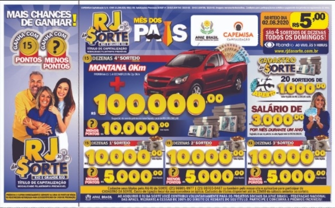 Para provar que seu pai não é pé frio, o RJ da Sorte acaba de anunciar uma novidade que vai premiar até quem pensava que não tem sucesso com o destino. Ao longo de agosto, nos títulos especiais do Mês dos Pais, além dos prêmios principais, a CAPEMISA Capitalização vai dar R$ 5.000 em cada um dos três primeiros sorteios das dezenas para quem fizer menos pontos, ou seja, quem ao final do sorteio tiver acertado a menor quantidade de dezenas. O sorteio deste domingo (2/08) está mesmo imperdível. Ficou assim: três sorteios das dezenas valendo R$ 10.000 cada para dividir entre quem acertar 15 pontos e R$ 5.000 para quem fizer menos pontos. No quarto sorteio especial, uma super caminhonete Montana 0km com R$ 100.000 em dinheiro na caçamba. É muita chance de ganhar!