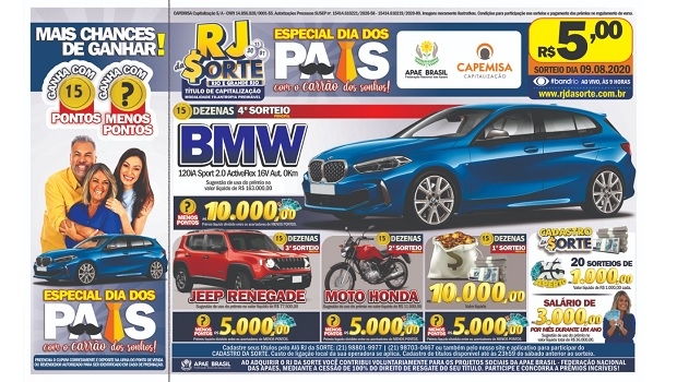 Premiação inédita para fazer a alegria dos pais de todas as idades. E tem mais. Nos outros três sorteios das dezenas estarão em jogo um Jeep Renegade 0km, uma moto Honda e R$ 10.000 para quem fizer mais pontos e três prêmios de R$ 5.000 (cada) para quem fizer menos pontos. Tudo isso sem aumentar o valor do título. É a chance que você esperava para ter na garagem seu carro dos sonhos.