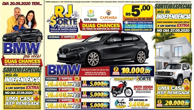 "A campanha do Especial do Mês da Independência será um marco, porque pela primeira vez os clientes do RJ da Sorte vão ter seu título válido para sorteio em mais de um fim de semana. Como atrativo principal, além da BMW que é o sonho de muita gente, a chance de ainda conquistar uma casa com carrão nas garagem. Por isso, estamos apostando na diversificação de público, com anúncios em mídias de alto impacto", revela o diretor de marketing Marco Elias.