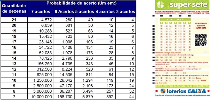 As probabilidades de acerto do Super Sete dependem da quantidade de dezenas marcadas na aposta, conforme quadro a seguir: