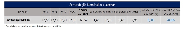 Ao se fazer a comparação entre a arrecadação nominal do período de janeiro a setembro de 2021, registrou-se um crescimento de 8,3% em relação ao mesmo período de 2020 e de 28,6% em relação a 2017. Para o subsecretário de Prêmios e Sorteios do ME, Waldir Marques, os números indicam a solidez do mercado nacional de loterias, apesar das dificuldades enfrentadas decorrentes da pandemia de covid-19.