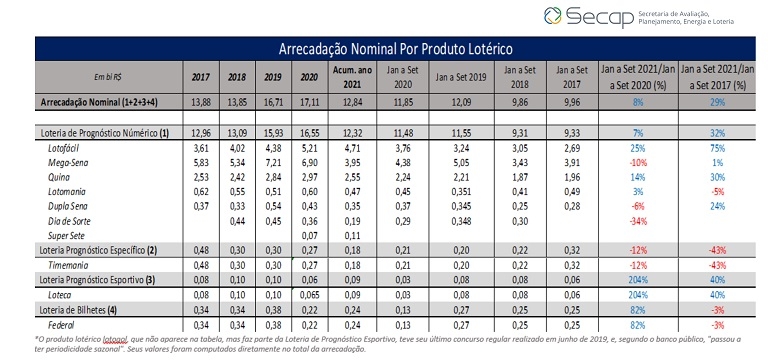 Segundo o boletim, os principais produtos lotéricos do país hoje são: a Lotofácil (36,7%), Mega-Sena (30,7%) e Quina (19,9%), tendo a Lotofácil ultrapassado a Mega-Sena como a mais vendida no Brasil. A publicação atribui a mudança ao fato de a Lotofácil ter passado a ser diária a partir de agosto de 2020 e ao pouco acúmulo dos concursos regulares da Mega-Sena nos últimos meses.