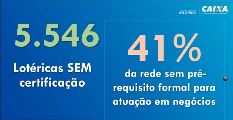 Durante a reunião que contou também com outros executivos da Superintendência de Canais da CEF, foram apresentados alguns estudos que apontam que 5.546 unidades lotéricas ainda não contam com pessoas certificadas para fazer os serviços no negocial, mesmo no TFL. O levantamento aponta que 41% da rede não tem pré-requisito formal para atuação em negócios.
