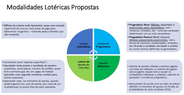 Loteria de aposta de cota fixa - conhecida como “apostas esportivas”. O apostador tenta prever o resultado de eventos esportivos, como placar, número de cartões, quem fará o primeiro gol etc., em jogos de futebol (possível, num segundo momento, evoluir para outros esportes). O apostador sabe, no momento da aposta, quanto poderá ganhar em caso de acerto, por meio de um multiplicador (a quota fixa) do valor apostado.
