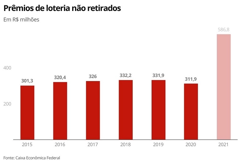 O salto no montante não resgatado em 2021 é explicado principalmente pelo apostador de São Paulo, que acertou as seis dezenas do prêmio da Mega da Virada 2020 e não apareceu dentro do prazo legal, perdendo assim um prêmio de R$ 162,2 milhões. Foi o maior já 'esquecido' na história das loterias da Caixa.