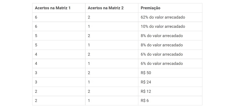 Dessa forma, o jogador poderá escolher de 6 a 12 números na primeira matriz. Em contrapartida, a segunda matriz poderá ter de duas a seis marcações. Assim como as demais loterias da Caixa, a +Milionária também contará com os sistemas de Teimosinha e Surpresinha para que os jogadores façam suas apostas.
