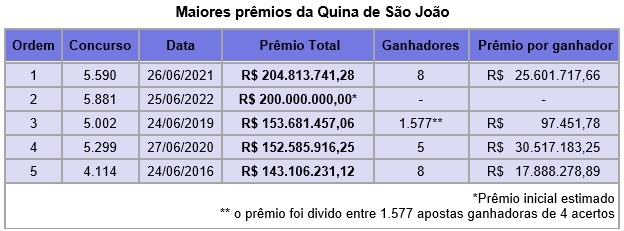 Como nos demais concursos especiais das Loterias CAIXA, a Quina de São João não acumula. Se não houver ganhadores na faixa principal, o prêmio do concurso 5.881 será dividido entre os acertadores da quadra, e assim sucessivamente.