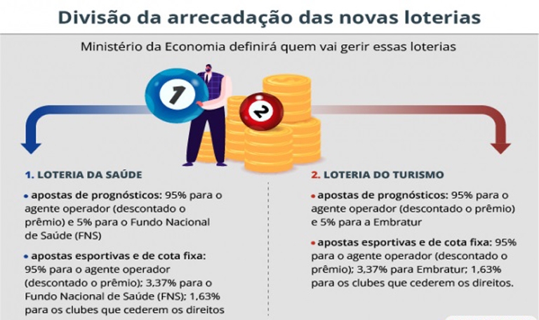 Na modalidade lotérica de prognósticos numéricos - em que o apostador tenta prever quais serão os números sorteados no concurso - 5% dos valores arrecadados pela Loteria do Turismo serão destinados à Embratur. No caso da saúde, o mesmo valor será repassado ao Fundo Nacional da Saúde (FNS).