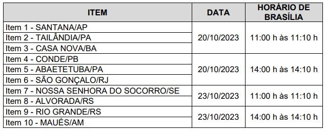 Para efetuar credenciamento, enviar propostas, lances, negociações e demais etapas do processo, os licitantes deverão acessar o seu espaço personalizado, intitulado “Área do Licitante”, através do Portal Licitações Caixa, e selecionar a opção “Acesso ao sistema”. O credenciamento deve ser feito até às 10h do dia 17 de outubro de 2023 e a entrega das propostas até às 10h30 da mesma data (sempre em horário de Brasília). Já os lances para cada unidade seguem o cronograma abaixo: