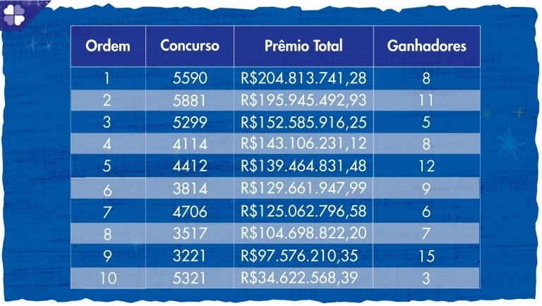 Os três maiores prêmios já ofertados pela Quina, incluindo os concursos especiais, foram R$ 204 milhões, R$ 195 milhões e 152 milhões. Confira, abaixo, detalhes dos dez maiores valores pagos: