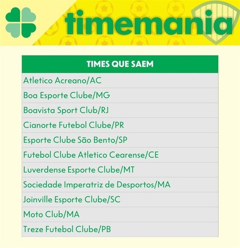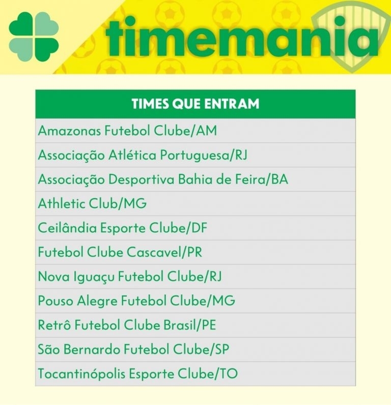 Os novos volantes já estão disponíveis para aposta nas lotéricas de todo o país. A mudança vale a partir do concurso 2088, com sorteio previsto para este sábado, 4 de maio. Os demais times seguem inalterados.