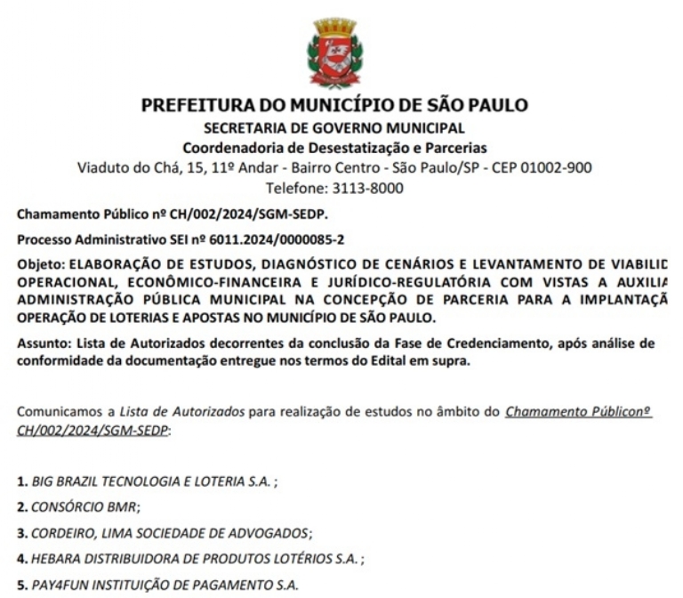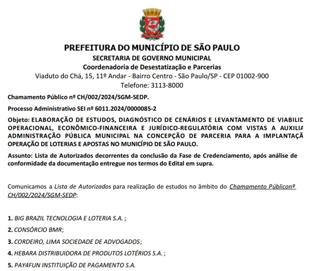 Em abril deste ano a Prefeitura do Município de São Paulo lançou o Edital de Chamamento Público 002/2024, convocando empresas a apresentarem estudos de diagnóstico de cenários e levantamentos de viabilidade operacional, econômico-financeira, jurídico-regulatória com vistas a auxiliar a Administração Pública na implantação e operação de loterias e apostas na cidade.
